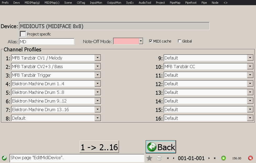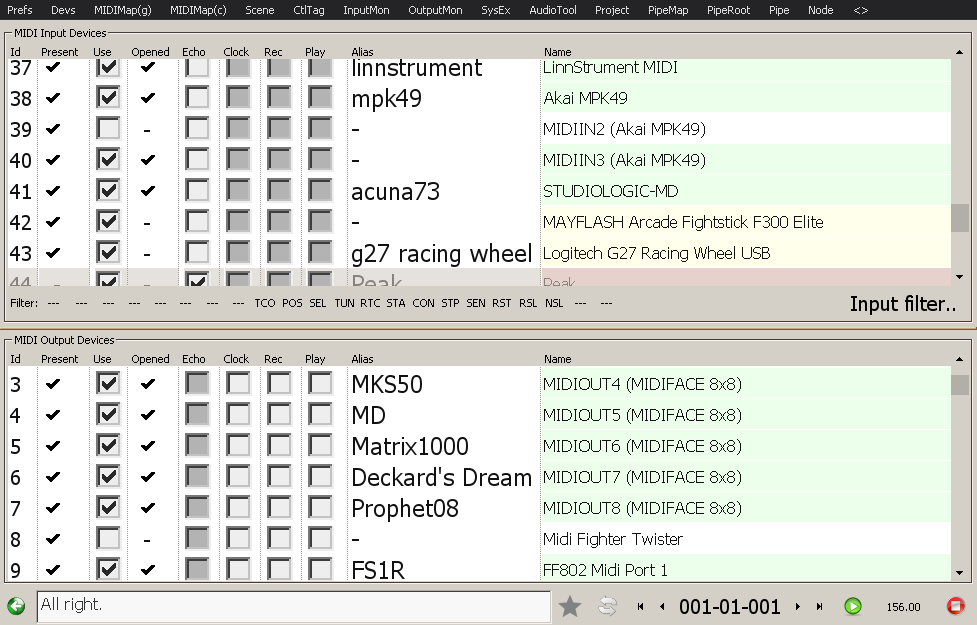 The output of the first pipe ("master") is sent to all nodes while the output of all other pipes is sent to the MIDI ports.